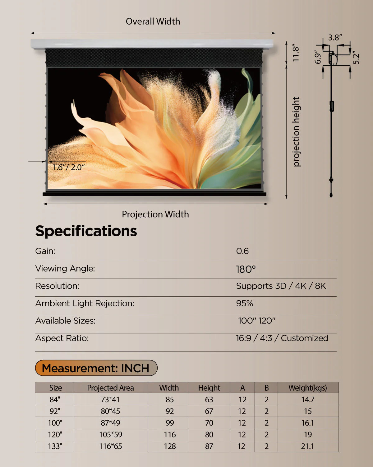 - Dostępne rozmiary: 100" (254 cm) i 120" (305 cm) przekątnej